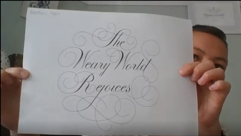 She holds up a piece she has been working on, “The Weary World Rejoices” and laughs, “you could easily sub in the weary Lara rejoices, because that is how I feel about this year. I feel strongly about hand lettering this piece right now as an expression of life in 2020.”